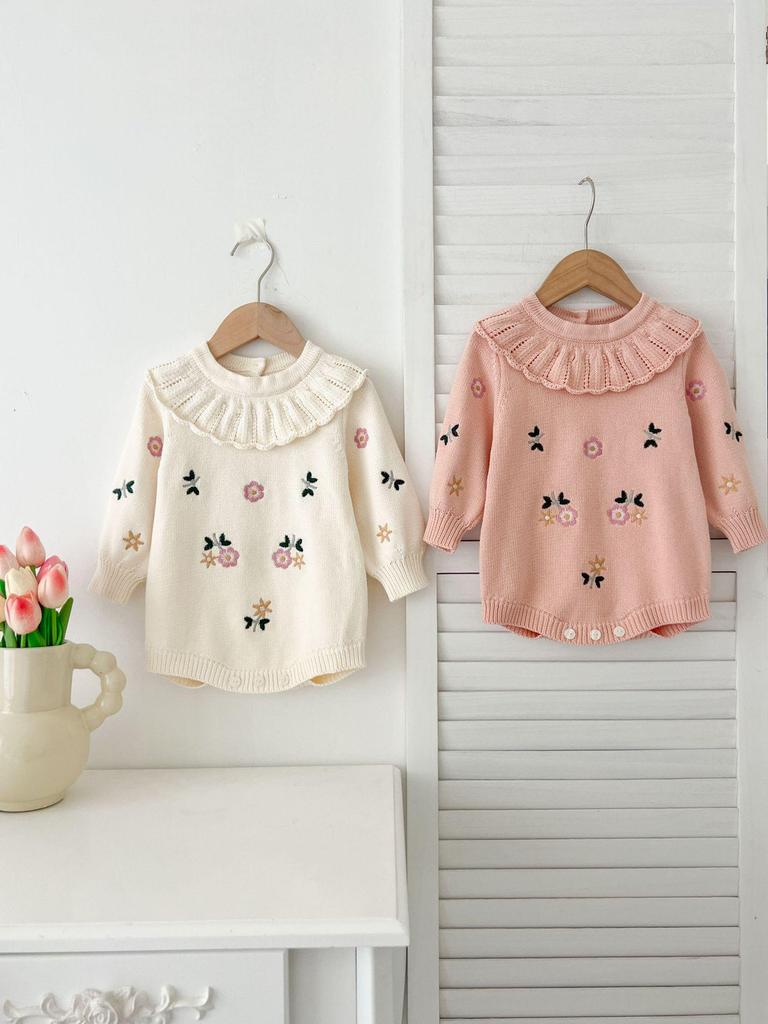 Baby Mädchen gestrickter Woll-Jumpsuit mit Stickerei und Umlegekragen - Frühlings-/Herbststil