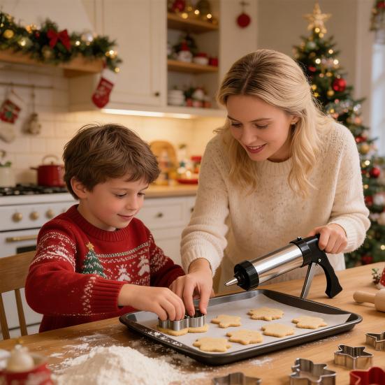 Dieser verbesserte Kekspress ist perfekt für Anfänger und erfahrene Bäcker.. Hergestellt aus hochwertigem, lebensmittelechtem Edelstahl, gewährleistet es Langlebigkeit, Rostbeständigkeit und Sicherheit während des Gebrauchs. Das ergonomische Design bietet einen bequemen Griff und müheloses Auspressen, sodass Sie mit Leichtigkeit verschiedene Keksformen kreieren können..