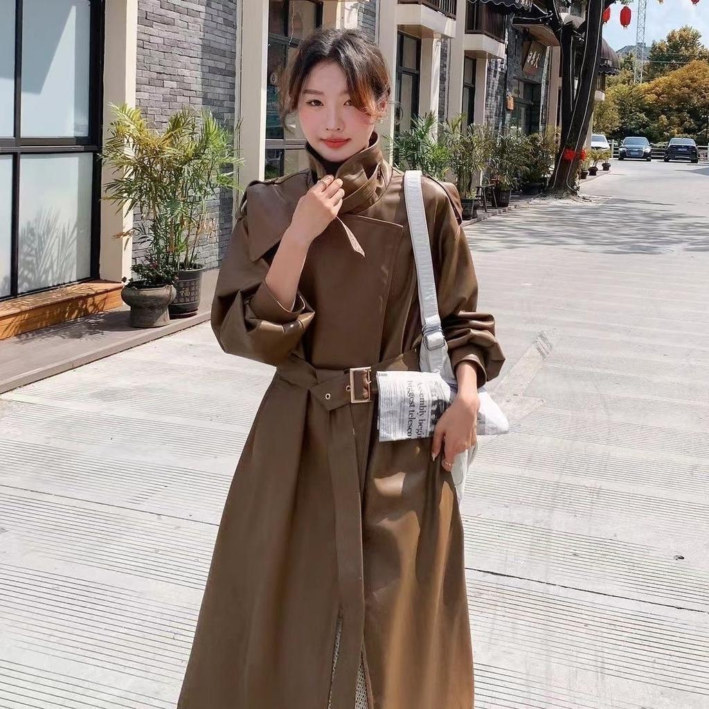 Neuer Herbst- und Winter-PU-Leder-Mantel für Damen, Lange über das Knie reichende Schlanke Windbreaker-Jacke mit Gürtel und Temperament-Mantel — günstig online bei Joom kaufen
