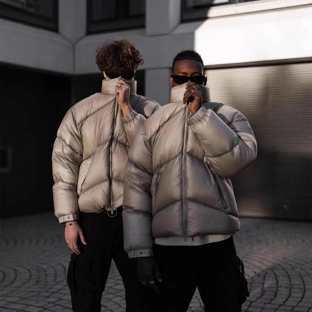 Amerikanische High Street Minimalistische Daunenwattierte Baumwolljacke mit Stehkragen und Reißverschluss mit Metall-Logo — günstig online bei Joom kaufen