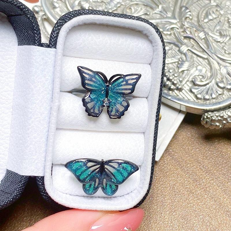 Sweet Cool Gun Black Enamel Dripping Oil Breaking Cocoon Butterfly Dark Opening Ring Design Sense Niche Stacked Ring Woman