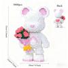 Blockbär hält Blumenstrauß Kreatives Ornament Rosa und Weiße Junge Bären Bausteine Spielzeug Kindergeburtstagsgeschenk Jubiläum Romantisches Geschenk