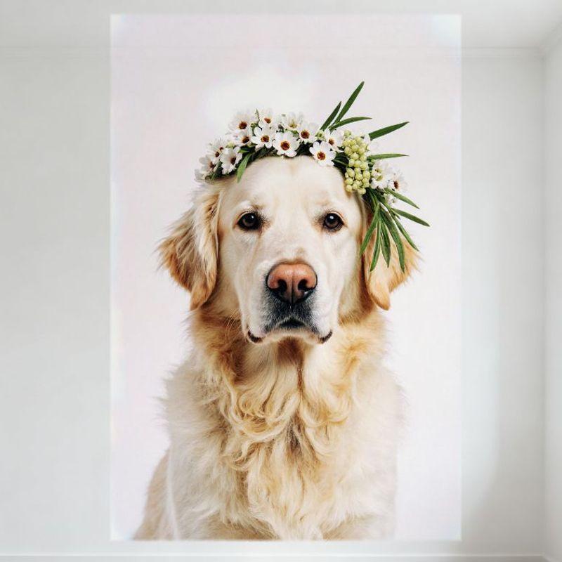 Golden Retriever with Light Golden Fur Tin Sign - Floral Wreath Metal Poster, Calm Dog Wall Decor for Bar Pub Home Cafe, 8x12 In