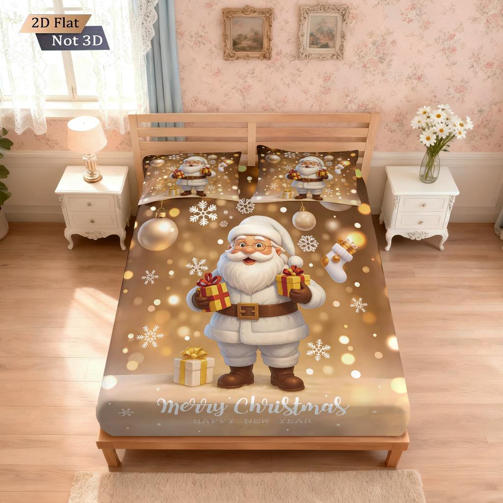 3pcs Merry Christmas Golden Santa Claus Print Bed Sheet Set Multi Size Soft Bedcover Bedroom Bedding Decoration Machine Washable