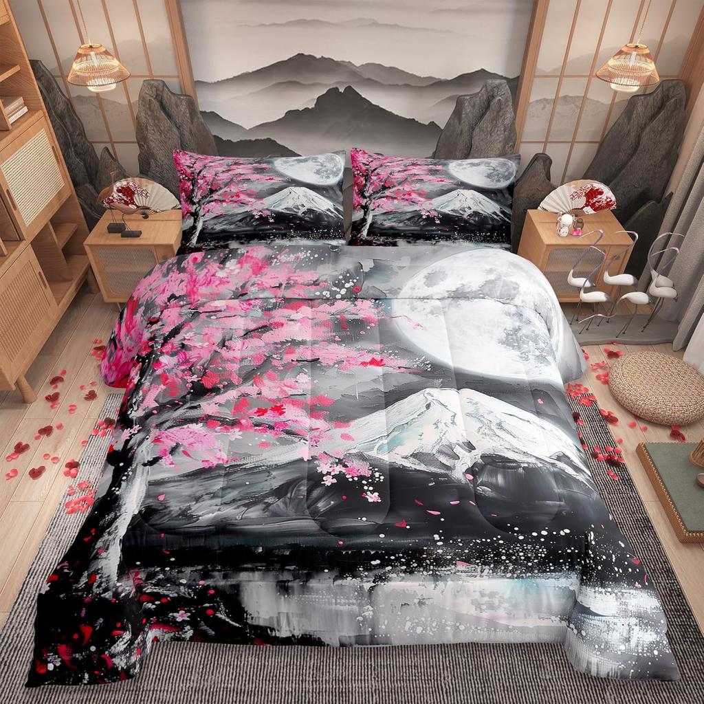 Japanisches Ukiyoe-Bettwäscheset (Queen-Size) mit Fuji-Berglandschaft, geeignet für Damen, Jugendliche und Herren, Heimtextilien, rosa Kirschblütenbaum