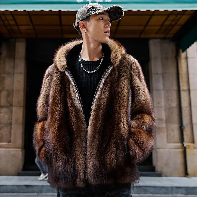 Herren Kurzmantel aus braunem Kunstfell Reißverschluss Stehkragen Warme Winterjacke Lässige Streetwear
