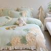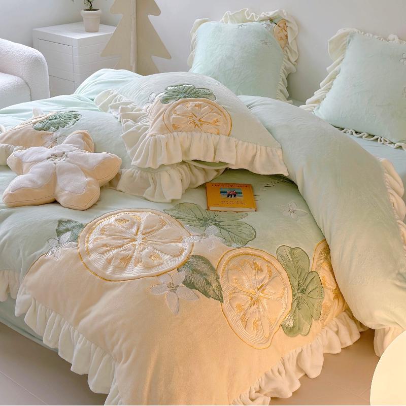 2025 Niedliches Zitronenmilch-Samt-Vierteiler Winter-Dicker Plüsch-Korallenfleece Bettbezug-Set