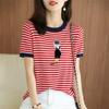 Gestreiftes besticktes Rundhals-T-Shirt aus mercerisierter Baumwolle für Damen Sommer Baumwollgarn Kontrast Strickpullover Kurzärmeliges Top