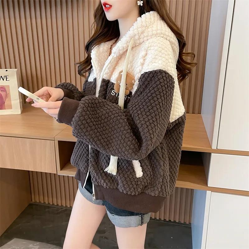 Neue farbblockierte Herbst-Winter-Reißverschluss-Oversize-Jacke mit Fleecefutter, verdicktes Doppel-Fleece-Damenoberteil