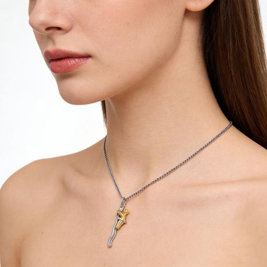 Diese verstellbare Halskette verfügt über eine 45+5cm lange Kette, die vielseitiges Tragen ermöglicht, von einer zarten Schlüsselbeinlänge bis zu einem längeren Stil, der perfekt für V-Ausschnitt-Outfits ist.. Gefertigt mit einem raffinierten zweifarbigen Kontrast aus Silber und Gold, zeigt der Anhänger glatte, glänzende Linien, die Schlichtheit mit Eleganz verbinden..