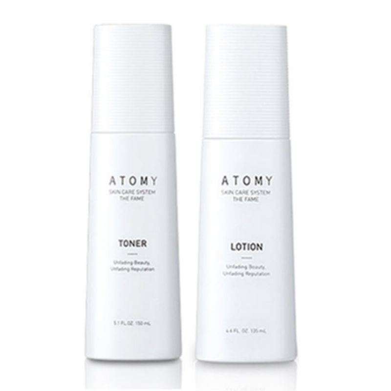 Erleben Sie tiefe Feuchtigkeit und beruhigende Pflege mit diesem hochwertigen Atomy The Fame Hautpflege-Set, das einen Toner enthält. (150ml) und Lotion (135ml). Dieses Duo wurde entwickelt, um Feuchtigkeit aufzufüllen, gereizte Haut zu beruhigen und die natürliche Hautbarriere zu stärken. Es sorgt für einen erfrischten und ausgeglichenen Teint und ist für die tägliche Anwendung geeignet.. Ideal für alle Hauttypen, besonders für trockene oder empfindliche Haut, die nährende Feuchtigkeit und sanfte Pflege sucht.