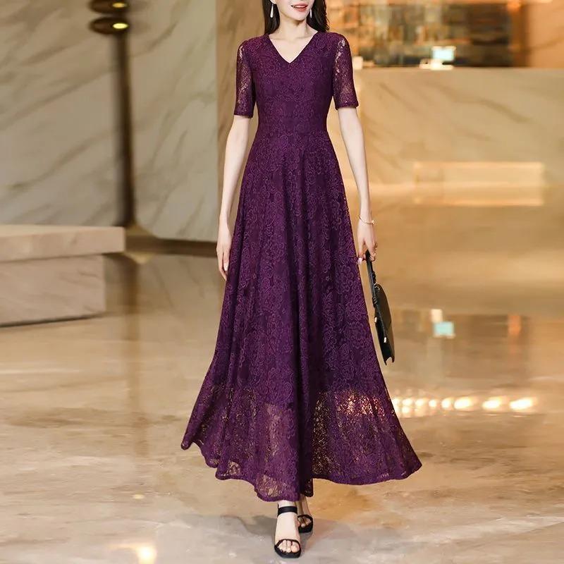 Damen Spitze Maxikleid V-Ausschnitt Kurze Ärmel A-Linie Elegant Party Abendkleid — günstig online bei Joom kaufen