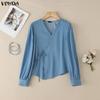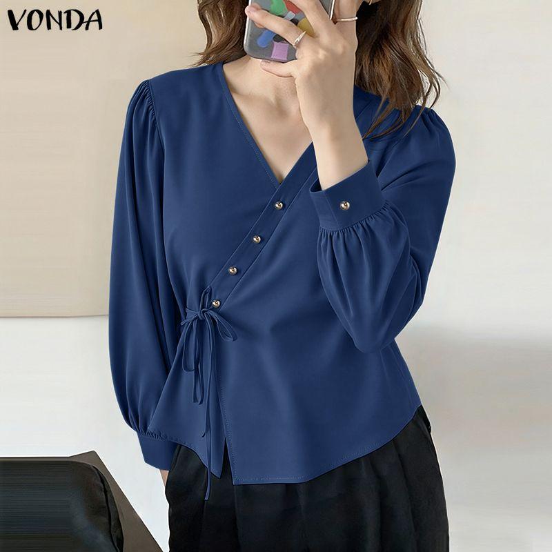 VONDA Women V-Neck Long Sleeve Lace-up Irregular Solid Color Casual Blouse
