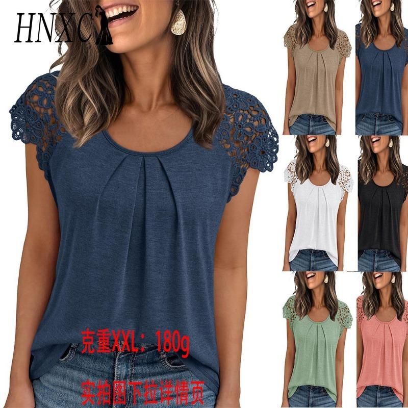 HNXC Damenmode, lässig, einfarbig, mit Druck, kurzärmelig, Rundhalsausschnitt, Blusen & Hemden