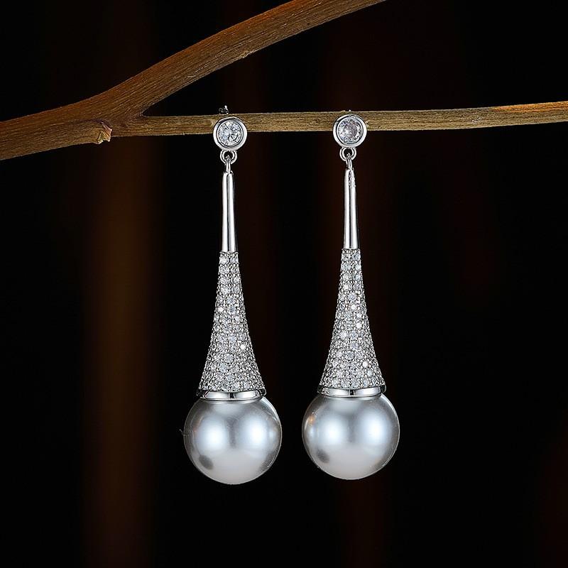 Perlen- und Mikro-Zirkonia-Hängeohrringe mit Stecker, Design für Party und Abendkleid