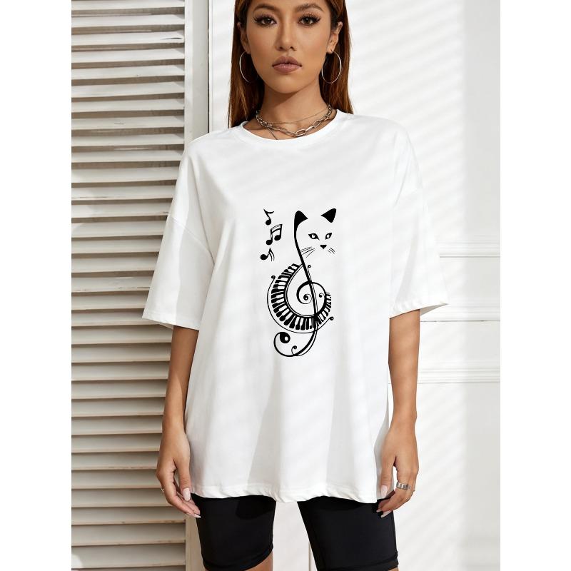 T-Shirt mit Rundhalsausschnitt Weiß Katze Musiknote Klaviertasten Druck Freizeitkleidung für Damen — günstig online bei Joom kaufen