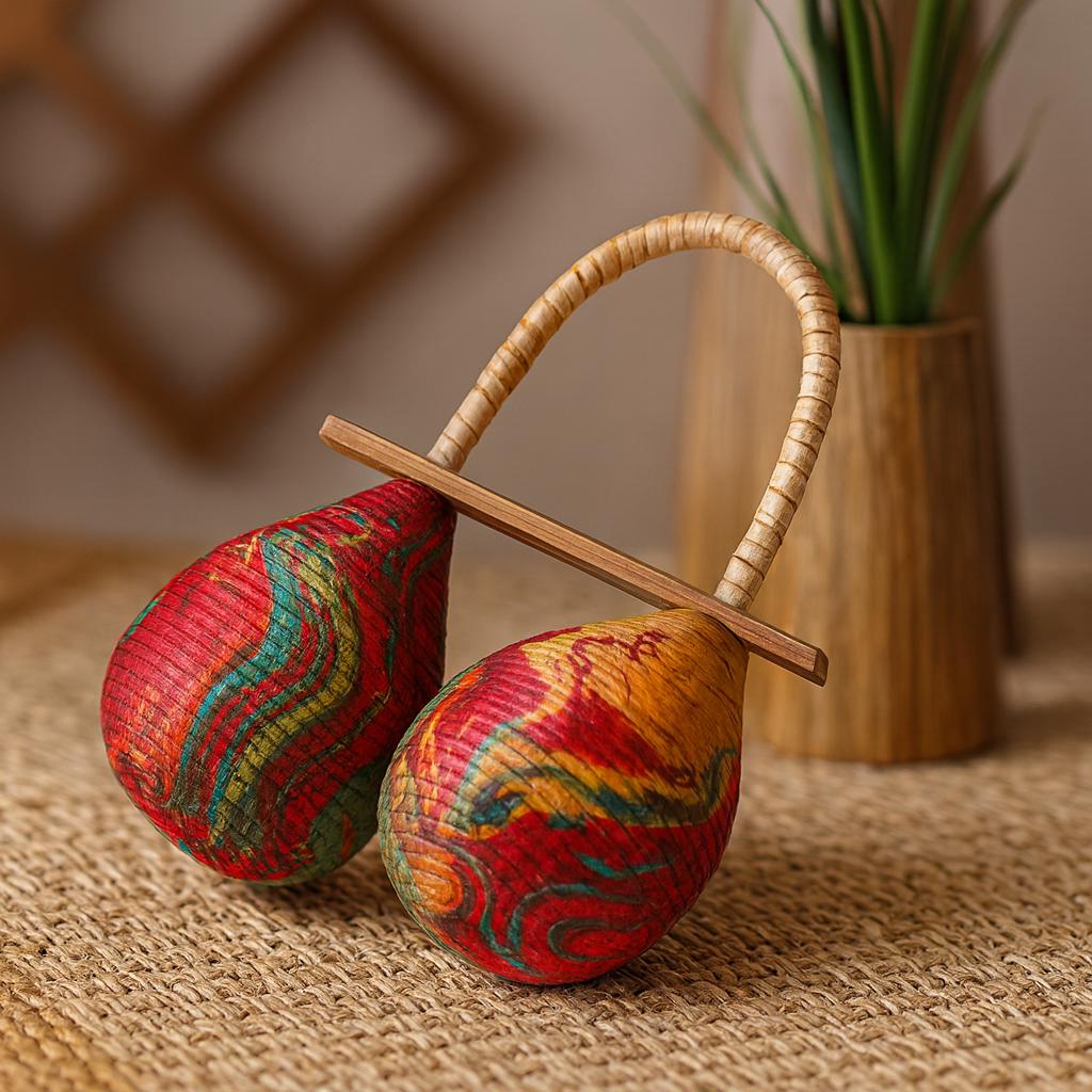Einmal geschüttelt, antwortet ein helles, erdiges Klappern — leicht in der Hand, mit einem sanften Spiralgriff und einem sicheren Schlaufengriff, der zum Spielen einlädt. Diese Maracas tragen den festlichen Puls der Gemeinschaft und verwandeln einfache Bewegung in klaren, lebendigen Rhythmus.. 🥁