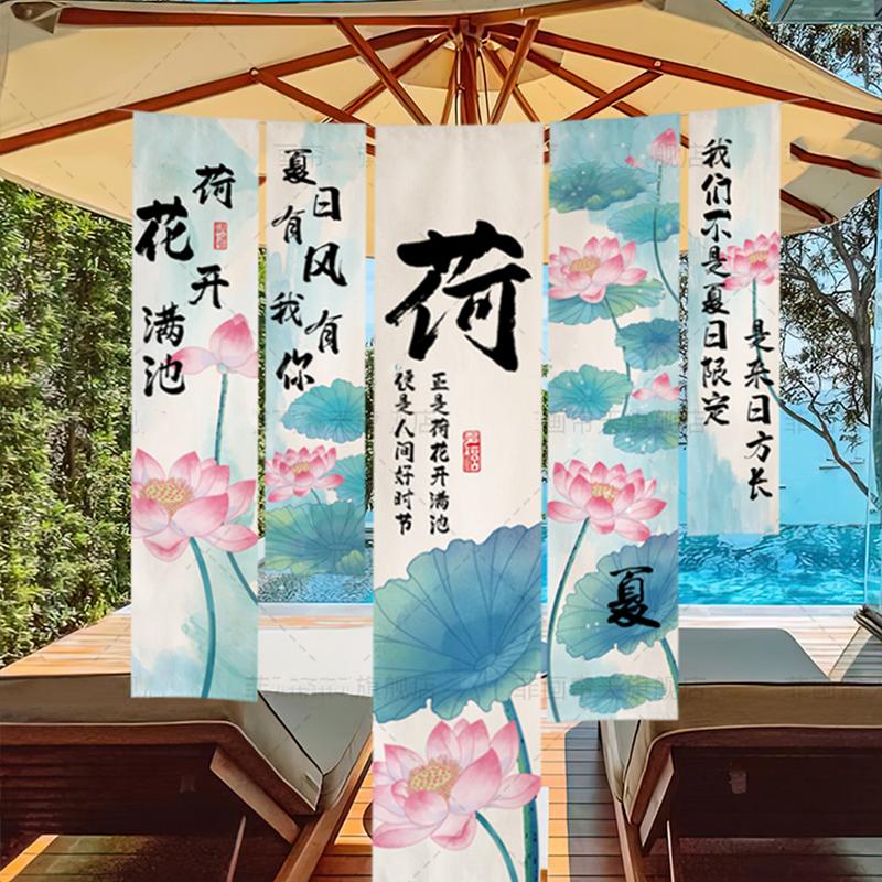 Chinese Style Banners Zen Lotus Printed Drapes Bathhouse Partition Outdoor Antique Scenery Decor Background Hanging Curtain