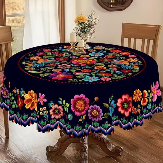 Verbessern Sie Ihr Esserlebnis mit dieser eleganten Tischdecke, die über eine schmutz- und wasserabweisende Beschichtung verfügt, die Flüssigkeiten abweist und die Reinigung vereinfacht.. Sein exquisiter Muschelrand verleiht eine raffinierte Note und verwandelt Ihre Tischdekoration von gewöhnlich in außergewöhnlich.. Verziert mit lebhaften mexikanischen Volkskunst-Blumenmustern, verleiht es jeder Mahlzeit ein exotisches und luxuriöses Gefühl..