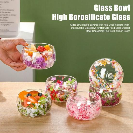 Diese vielseitige Glasschüssel ist so konzipiert, dass sie sowohl heiße als auch kalte Speisen aufnehmen kann, sodass Sie gefrorenen Joghurt oder heiße Suppe servieren können, ohne die Behälter wechseln zu müssen.. Aus verdicktem, strapazierfähigem Glas gefertigt, widersteht es täglichen Stößen und hält länger als gewöhnliche Schüsseln. Mit einem einzigartigen Doppelschichtdesign mit echten getrockneten Blumen, die zwischen dem Glas eingeschlossen sind, verleiht es Ihrem Speiseerlebnis eine elegante Note..