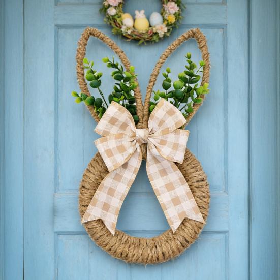 Entzückendes hasenförmiges Design: Dieser Kranz, gefertigt in Form eines Häschens mit zwei aufrechten langen Ohren und einer abgerundeten Körperkontur, versprüht verspielten Charme.. Sein kindlicher Spaß und seine festliche Stimmung machen es zu einer idealen Dekoration für Osterfeiern.. Die einzigartige Silhouette sticht als freudiges Symbol der Frühlingserneuerung und der Festtagsstimmung hervor.