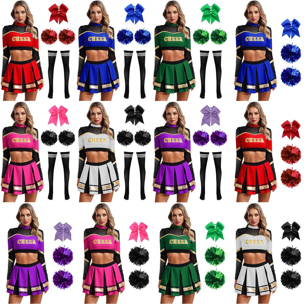 Damen Cheerleading Performance Tanz Outfit Langarm Stehkragen Strass Crop Top Faltenrock Haargummi Set — günstig online bei Joom kaufen