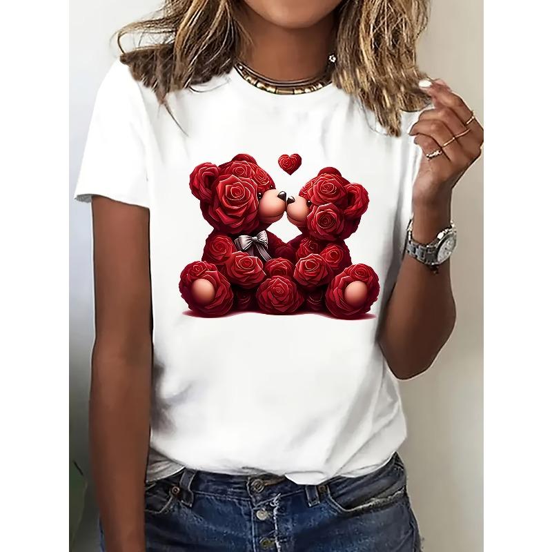 Europäische Größe Romantisches verträumtes süßes Damen-Kurzarm-T-Shirt - Zarter Rosen-Bären-Paar-Druck, leicht zu kombinierendes lässiges Oberteil mit Rundhalsausschnitt — günstig online bei Joom kaufen