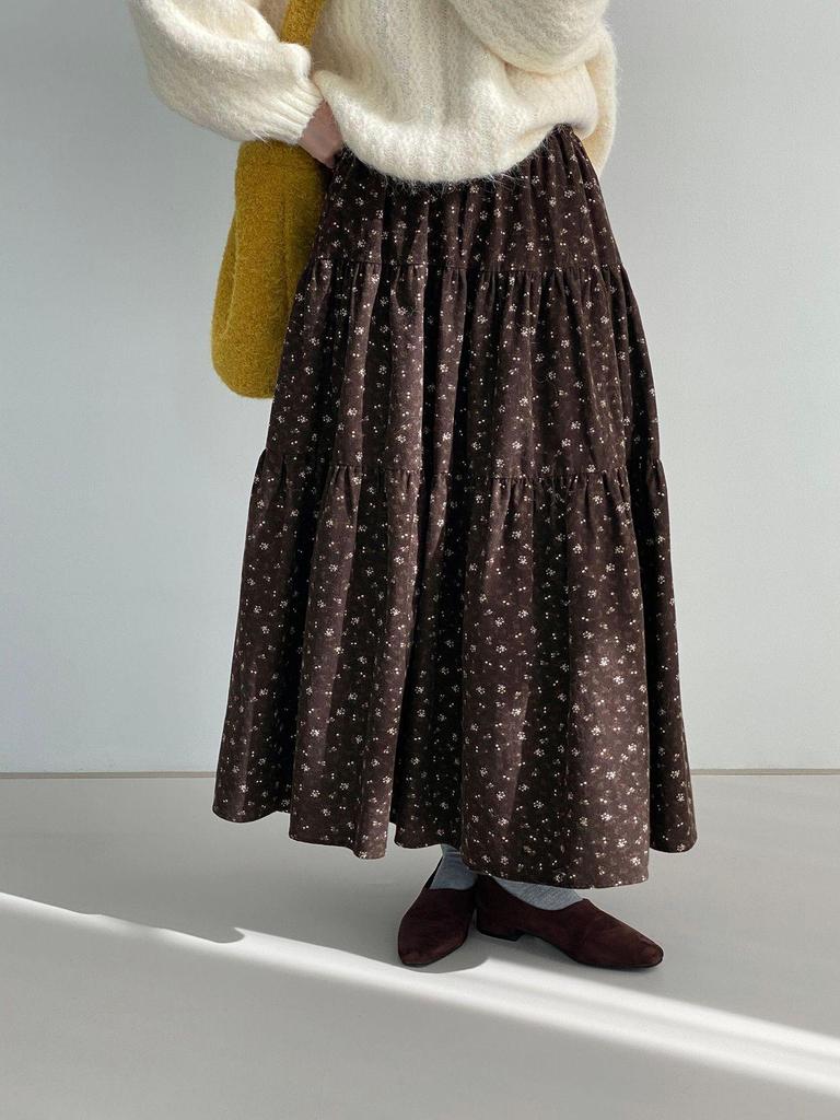 Women's Retro Coffee Floral Tiered Half-Skirt: Elastic Waist, Slimming Fit, Good Drape