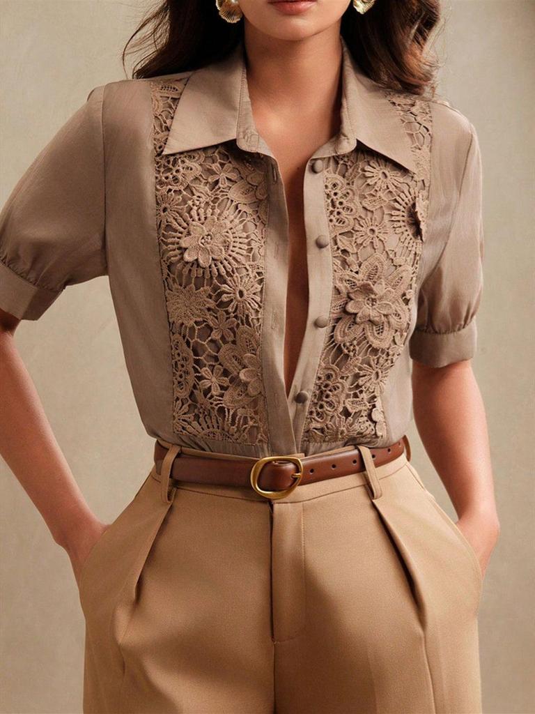Dieses stilvolle kurzärmelige Hemd ist perfekt für legere Anlässe und bietet eine Mischung aus Komfort und Eleganz.. Gefertigt aus hochwertigem Polyester, sorgt das Hemd für ein weiches und leichtes Tragegefühl.. Sein durchgehendes Muster und der runde Halsausschnitt sorgen für einen zeitlosen Look, während das aufwendige Spitzenpatchwork und die gesteppte Verzierung einen Hauch von Raffinesse verleihen.. Umarme den Trend 2025 mit diesem schicken und vielseitigen Garderoben-Essential.