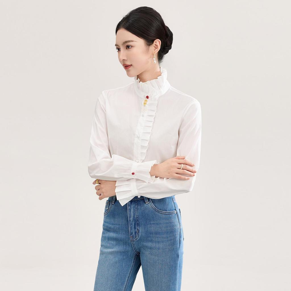 Damen Hemd aus reiner Baumwolle mit französischem Rüschenbesatz - Frühlings-Oberteil mit Micro-Flare Langarm — günstig online bei Joom kaufen