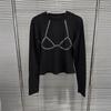 2025 Damen Schwarz Strass Rundhals Schlankmachendes T-Shirt, Herbst/Winter Kollektion