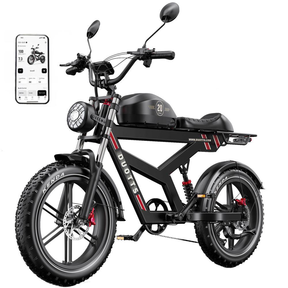 Das F20 Elektrofahrrad ist perfekt für Offroad-Abenteuer und den Stadtverkehr geeignet und mit einem Hochleistungs-Vollfederungssystem ausgestattet, das eine sanfte und komfortable Fahrt auf jedem Terrain bietet.. Es ist ein Elektrofahrrad im Vintage-Stil mit moderner Leistung.