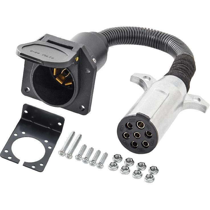 7-poliger runder zu 7-poliger Messer-Anhängeradapter: Dieser 7-polige auf 7-polige Adapter wandelt den 7-poligen runden Stecker auf der Fahrzeugseite in einen 7-poligen Anhängerstecker nach RV-Standard auf der Anhängerseite um.