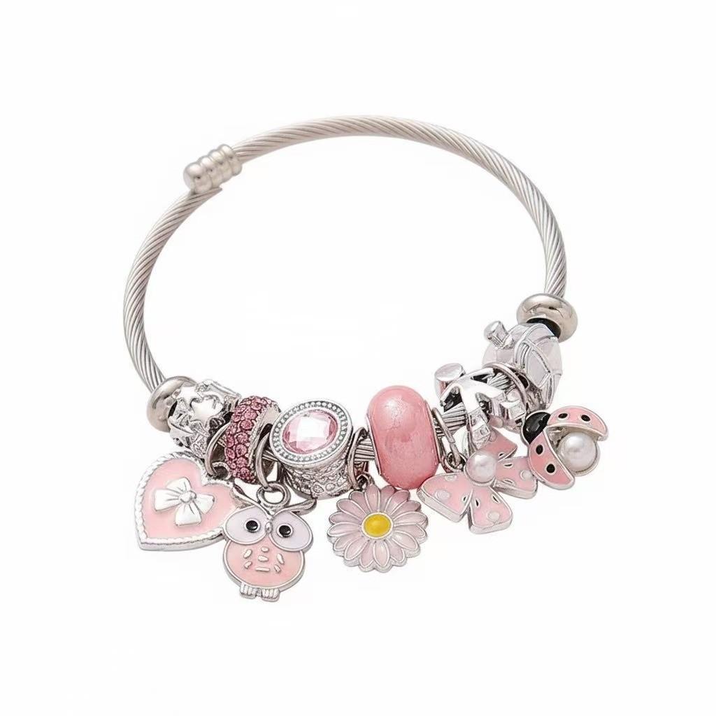 Dieses DIY-Armband ist aus Edelstahl gefertigt und hat eine galvanisierte Oberfläche, die ihm Langlebigkeit und ein stilvolles Aussehen verleiht und es angenehm für den täglichen Gebrauch macht.. Das Design umfasst bezaubernde Tiermotive wie Eulen und Marienkäfer, perfekt für die Sommer mode.