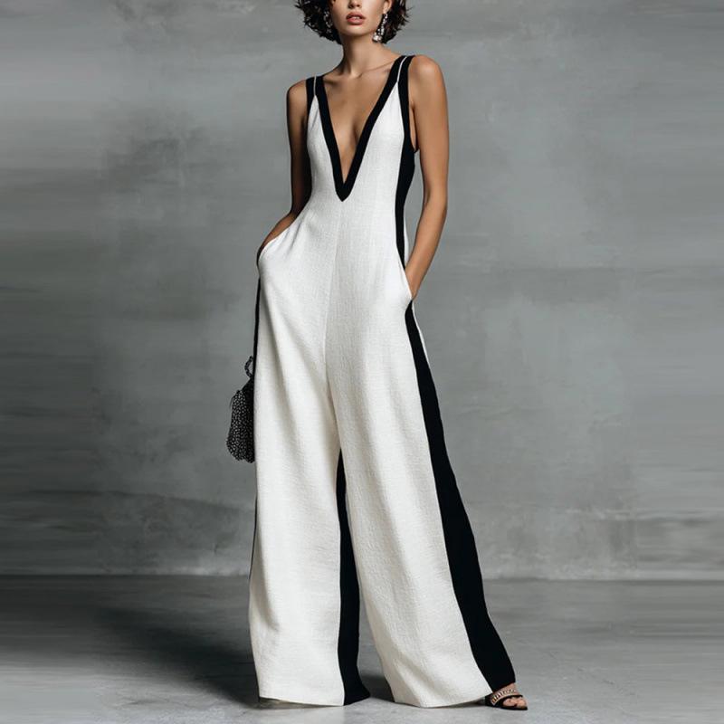 2026 Black & White Color Block Women's Deep V-Neck Jumpsuit with Thin Straps