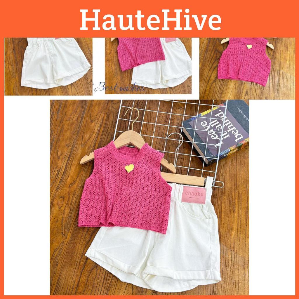 Stylish Summer Ensemble: This delightful two-piece set features a trendy dragon fruit tank top and stylish white shorts, perfect for summer outings or playdates.