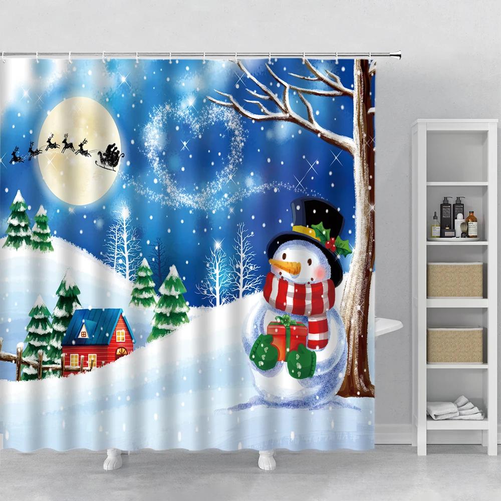 Happy Snowman Christmas Shower Curtain Snowflake Santa Claus New Year Gift Bathroom Waterproof Bath Curtain Home Decor With Hook