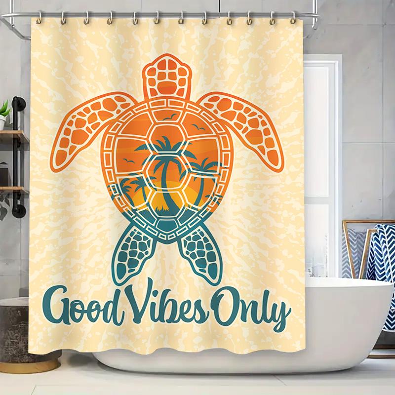 Sunset Sea Turtle Shower Curtain: Good Vibes Only Beach Decor with Palm Trees Yellow Bath Mat Set for Bathroom