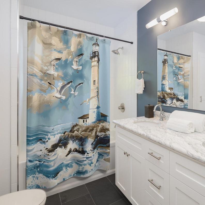 Lighthouse Shower Curtain, Nautical Shower Curtain, Lighthouse on the Beach Shower Curtain for Bathtub