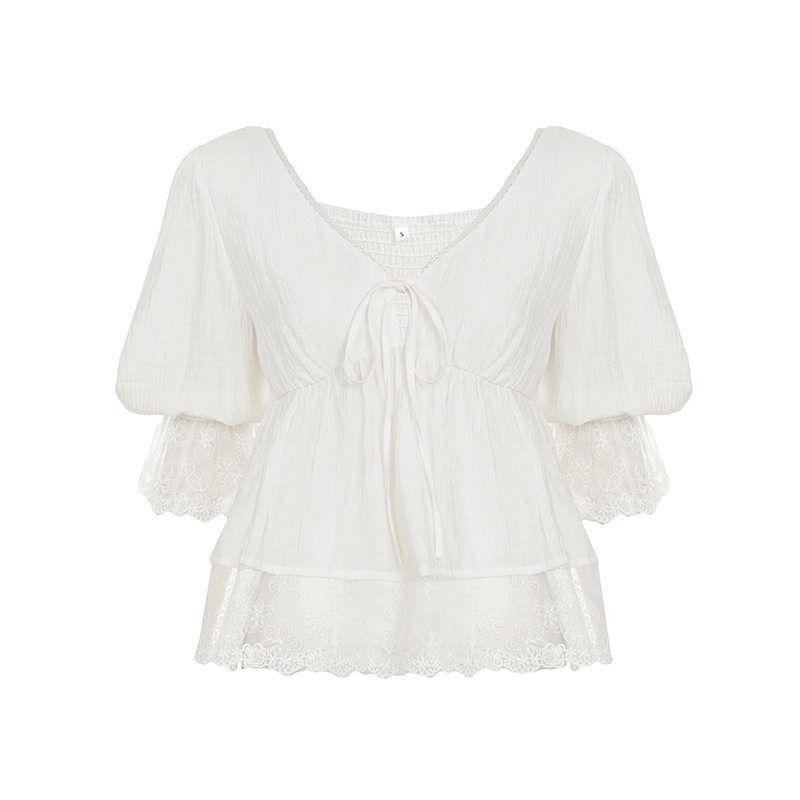 Pure Desire Style Lace Splicing V-Neck White Shirt Top 2026 Spring and Summer New Style Bow Tie Casual T-Shirt for Women — günstig online bei Joom kaufen