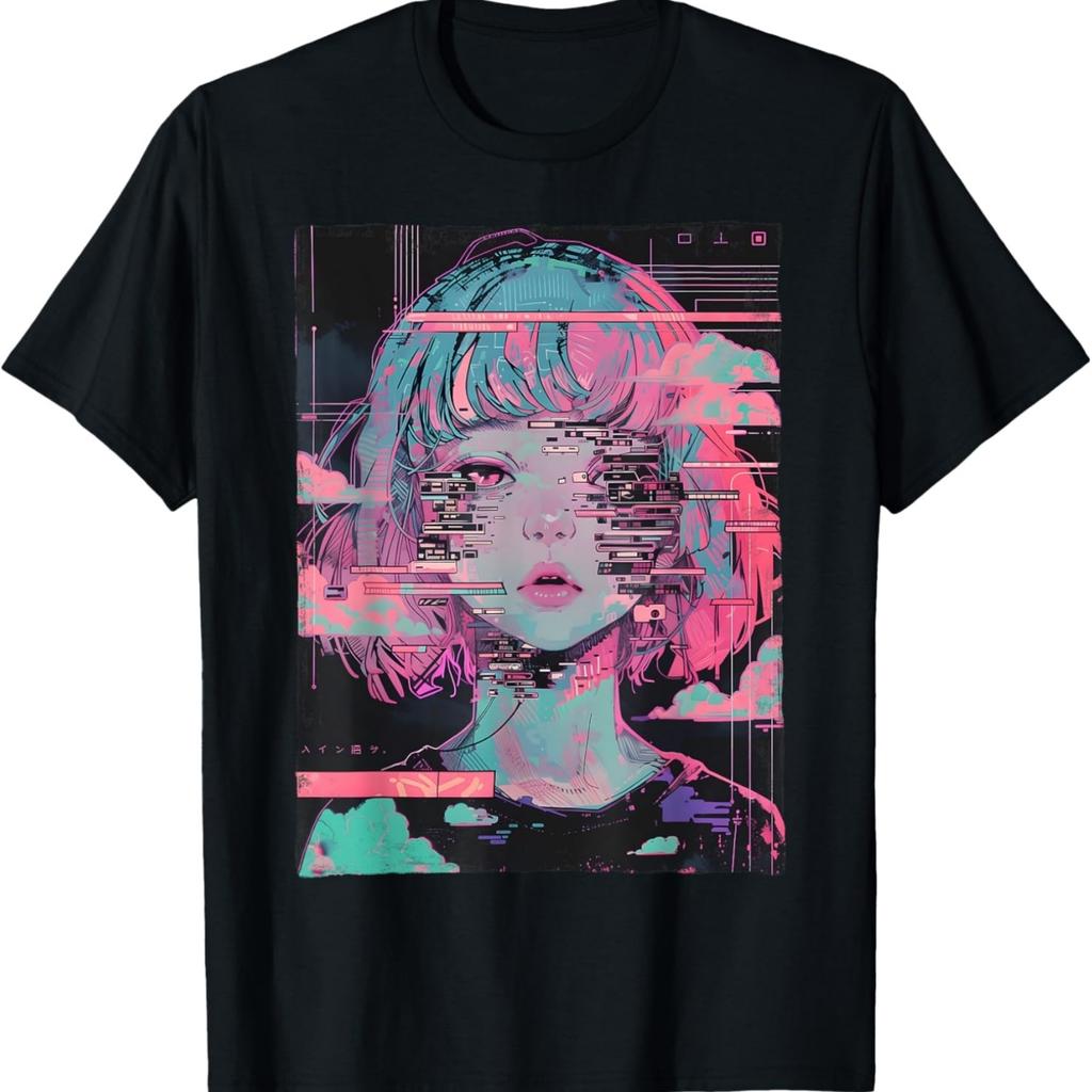 Anime Girl Vaporwave Glitch Cyber Goth E-Girl Distressed T-Shirt