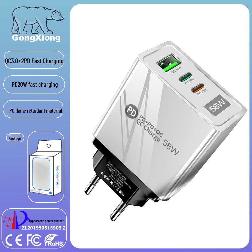58W Dual Fast Charger with 2PD+QC3.0, Compatible with EU/US/UK Plugs.