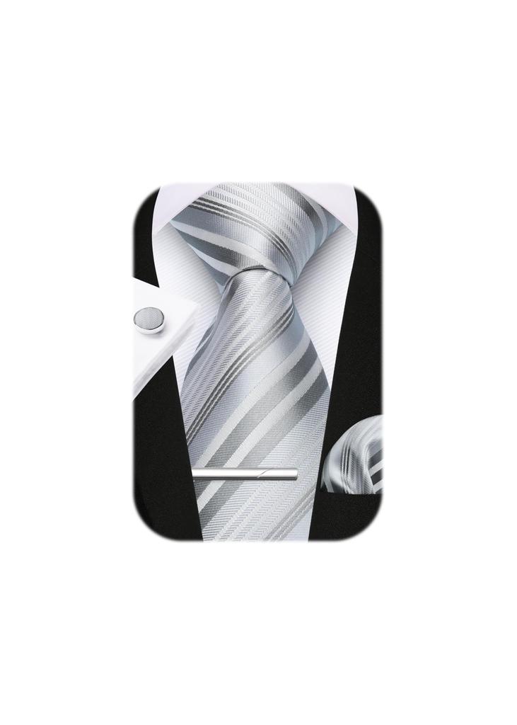 [HISDERN] Wedding Silver Tie Men's Tie Pocket Square Tie Pin Cufflinks 4-Piece Set Stripe Pattern For Weddings, Job Hunting, Entrance Ceremonies,