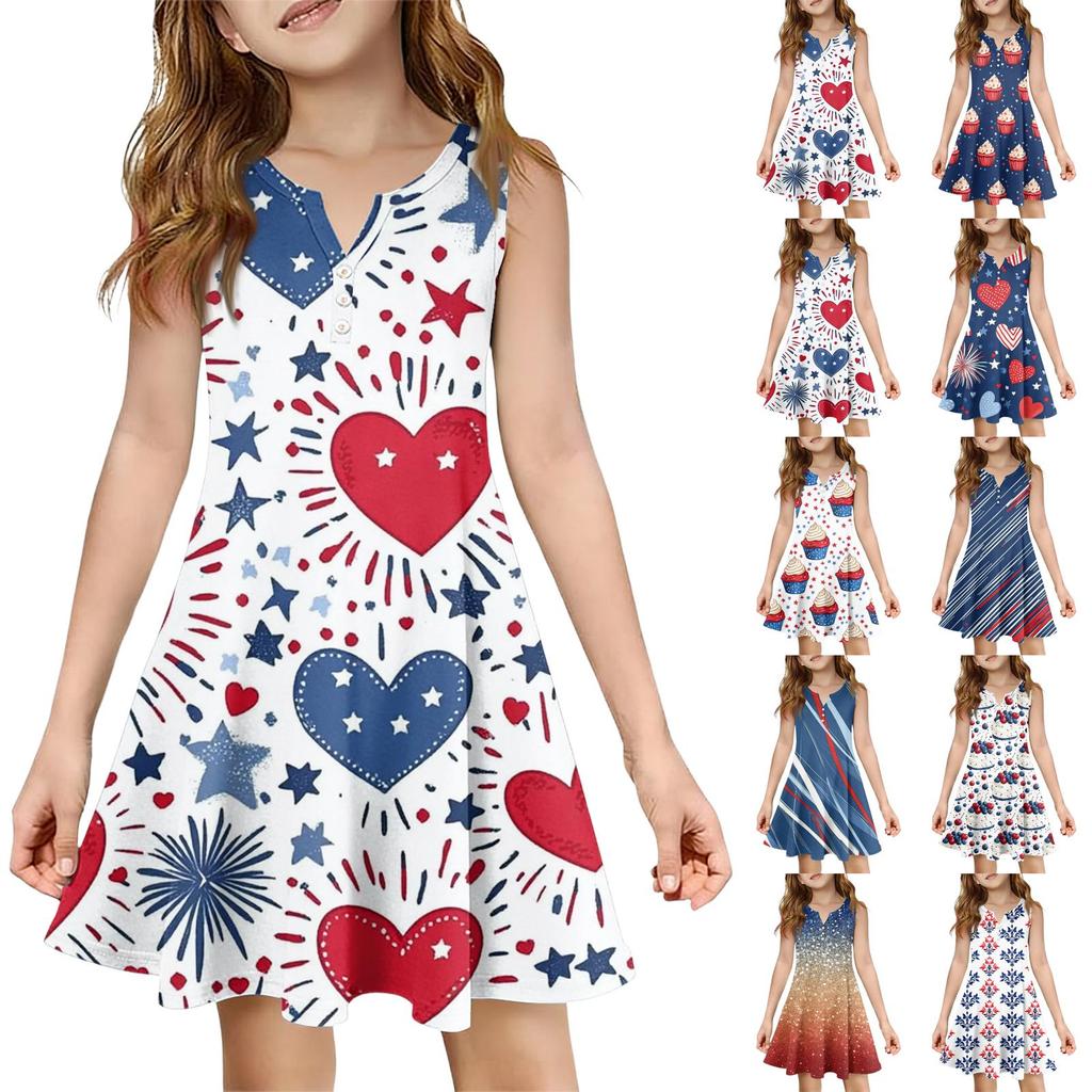 Sommerkleid für Mädchen, ärmelloses Kleid mit Tasche, farbig und gemustert, lässiges Kleid, ärmelloses Partykleid, Unabhängigkeitstag