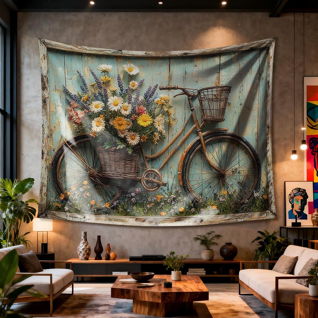 Vintage Fahrrad mit Blumen Digitaldruck Polyester Wandteppich geeignet für Wohnzimmer Schlafzimmer Büros Bars Partys