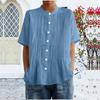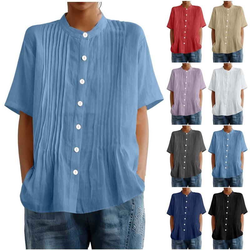 Womens Light Blue Pleated Blouse Casual Stand Collar Short Sleeve Button Up Solid Color Top — günstig online bei Joom kaufen