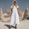 Damen Vintage Baumwoll-Leinen Kapuzen-Halbreißverschluss Mittellanges Kleid