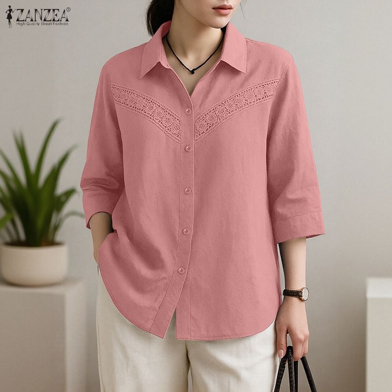 ZANZEA Women Lace Patchwork Casual Turn Down Collar Loose 3/4 Sleeve Blouse