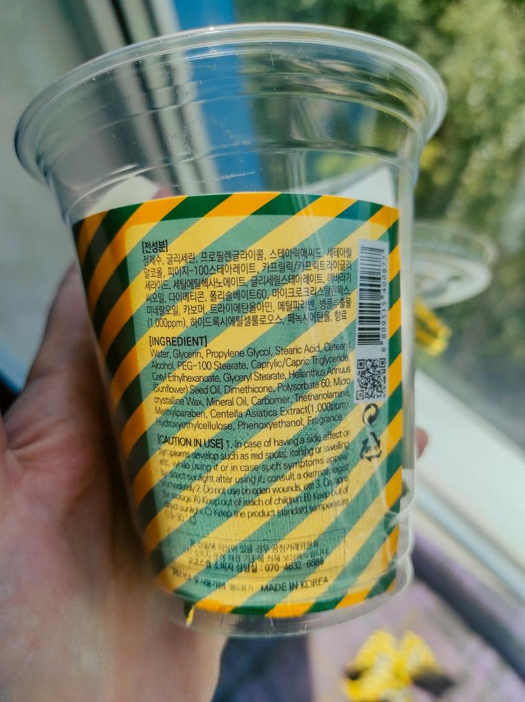 Νερό, Γλυκερίνη, Προπυλενογλυκόλη, Στεατικό Οξύ, Κητεαρυλική Αλκοόλη, Στεατικό PEG-100, Τριγλυκερίδιο Καπρυλικό/Κάπρικο, Αιθυλοεξανοϊκό Κητύλιο, Στεατικό Γλυκερύλιο, Helianthus Annuus (Ηλιοτρόπιο) Σπορέλαιο, Dimethicone, Polysorbate 60, Microcrystalline Wax, Mineral Oil, Carbomer, Triethanolamine, Methylparaben, Centella Asiatica Extract(1000 ppm), Υδροξυαιθυλοκυτταρίνη, Φαινοξυαιθανόλη, Άρωμα
