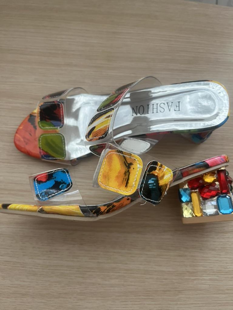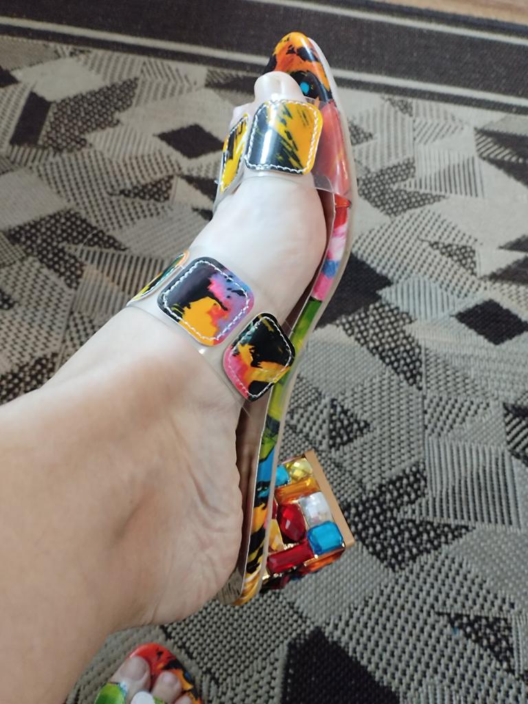 Women's Colorful Chunky Heeled Sandals Rhinestone Decor Slip On Open Toe Mid Heels Stylish Daily Wear Sandals — buy online with free worldwide shipping!
